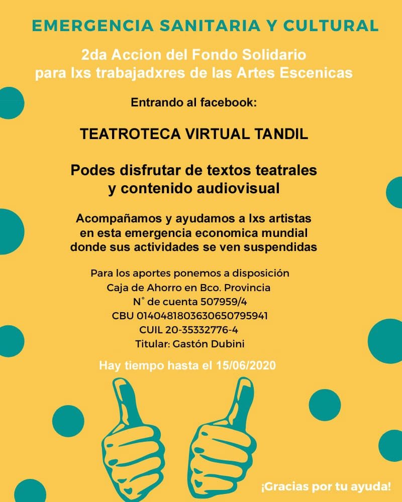 Fondo solidario económico para lxs trabajadxres artistas (teatro-circo) de la ciudad de Tandil. La situación de cuarentena nos viene atravesando diariamente como país y no es ajena a la realidad local.